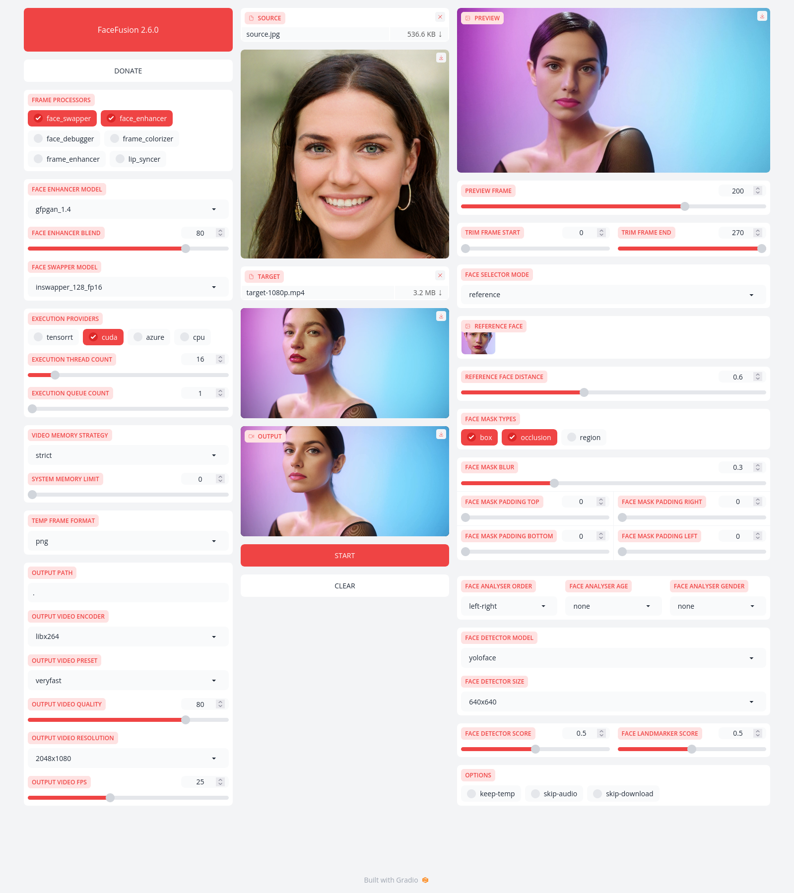 * Modernize CI * Modernize CI * Modernize CI * Implement dynamic config (#518) * Implement dynamic config * Fix apply config * Move config to general * Move config to general * Move config to general * Add Windows installer * Add --open-browser * Add Windows installer part2 * Use non-commercial license for the installer * Fix create environment in installer * Fix openvino for installer * Fix conda for installer * Fix conda for installer, Remove python and pip as it is part of conda * Improve installer - guess the path * Fix CI * Add missing accept-source-agreements to installer * Install WinGet * Improve WinGet installation steps * Use absolute path for winget * More installer polishing * Add final page to installer, disable version check for Gradio * Remove finish page again * Use NEXT for metadata * Support for /S mode * Use winget-less approach * Improve Conda uninstall * Improve code using platform helpers (#529) * Update dependencies * Feat/fix windows unicode paths (#531) * Fix the Windows unicode path dilemma * Update dependencies * Fix the Windows unicode path dilemma part2 * Remove conda environment on uninstall * Fix uninstall command * Install apps for local user only * Add ultra sharp * Add clear reality * Update README and FUNDING * Update FUNDING.yml * Prevent preview of large videos in Gradio (#540) * Fix order * Refactor temporary file management, Use temporary file for image processing (#542) * Allow webm on target component * Reduce mosaic effect for frame processors * clear static faces on trim frame changes * Fix trim frame component * Downgrade openvino dependency * Prepare next release * Move get_short_path to filesystem, Add/Improve some testing * Prepare installer, Prevent infinite loop for sanitize_path_for_windows * Introduce execution device id * Introduce execution device id * Seems like device id can be a string * Seems like device id can be a string * Make Intel Arc work with OpenVINOExecution * Use latest Git * Update wording * Fix create_float_range * Update preview * Fix Git link